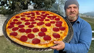 A giant, cheesy pepperoni pizza is made in the backyard in this video. I cook a giant homemade pizza outdoors using simple ingredients and real outdoor cooking techniques. The dough is stretched, covered with rich tomato sauce, loaded with pepperoni, and topped with a mountain of melted cheese. Watching this pizza cook is incredibly satisfying, crispy crust, bubbling cheese, and the perfect homemade flavor.