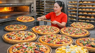 How to make traditional pizza with sausage, squid, and cheese to sell at the market by Trieu Mai Huong. In this video, I share how to make traditional homemade pizza topped with sausage, fresh squid, and melted cheese to sell at the local market. From preparing the soft pizza dough and spreading flavorful sauce to arranging the toppings and baking until golden and bubbly, every step is done with care. The combination of savory sausage, tender squid, and rich melted cheese creates a delicious result.